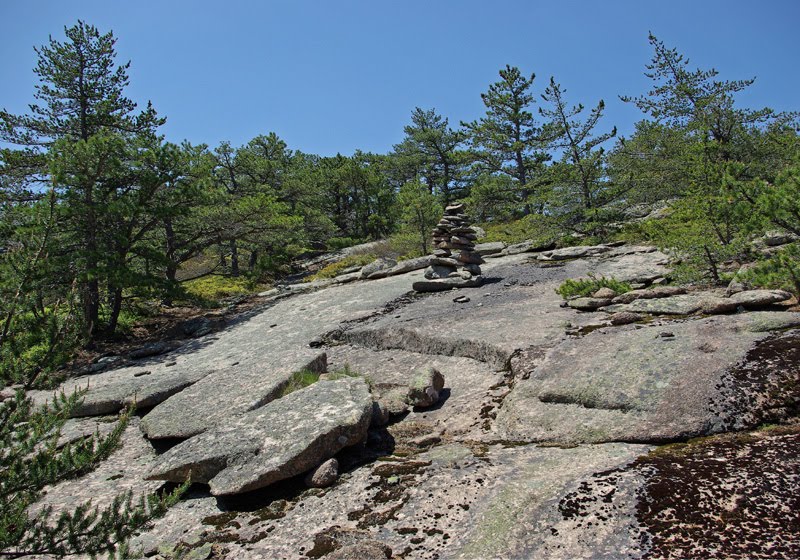 We turned south on the Cadillac Mtn. trail. We had been warned there were no markers near the trail but a after a little searching off trail we found our first cairn and were on our way. The trail shows little wear but the cairns keep you on track.